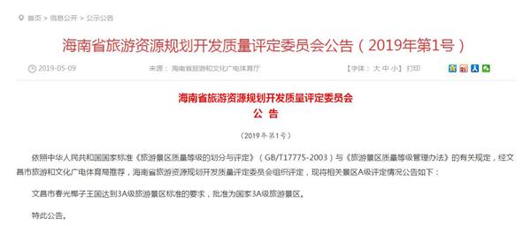 5月9日,海南省旅游資源規(guī)劃開發(fā)質(zhì)量評定委員會發(fā)布公告,依照中華人民共和國國家標準《旅游景區(qū)質(zhì)量等級的劃分與評定》與《旅游景區(qū)質(zhì)量等級管理辦法》的有關(guān)規(guī)定,春光椰子王國達到國家國家3A級旅游景區(qū)標準,被批準為國家3A旅游景區(qū),為文昌再添一個國家級景區(qū)。