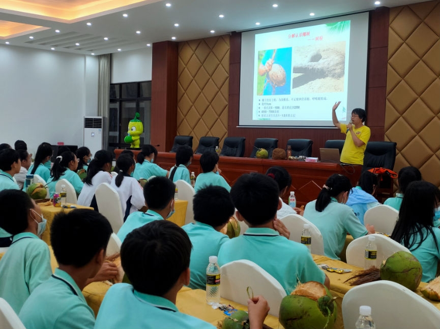 5月26日,椰子王國特色研學課堂迎來了首批研學的學子,中國熱帶農業科學院龍翊嵐教授在研學課堂上的生動教學讓學子們飽嘗了一頓“椰子文化大餐”。